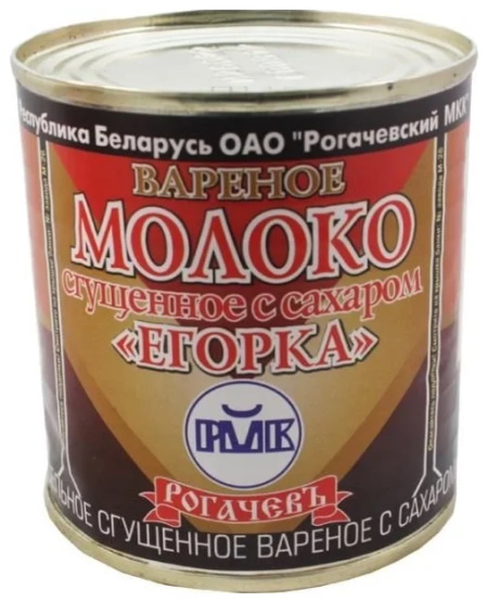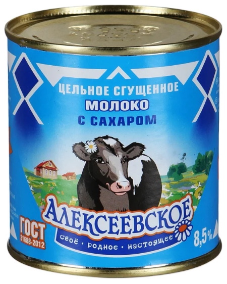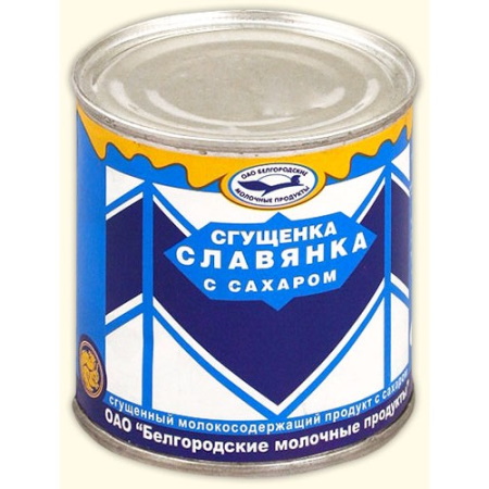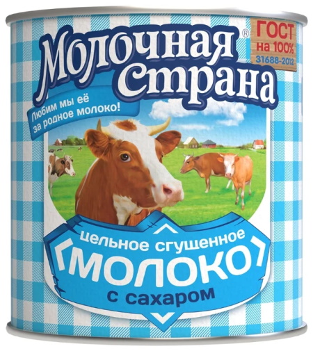 In Russland hergestelltes Markenprodukt, hergestellt nach GOST für milchhaltige Kondensnahrung. Die Zusammensetzung umfasst rekonstituierte Magermilch, rekonstituierte Molke, Zucker, Butter, Milchfettersatz (raffinierte Mischung aus Sonnenblumen- und Palmöl) sowie Stabilisatoren.