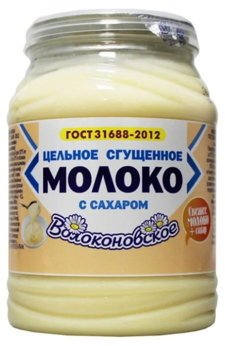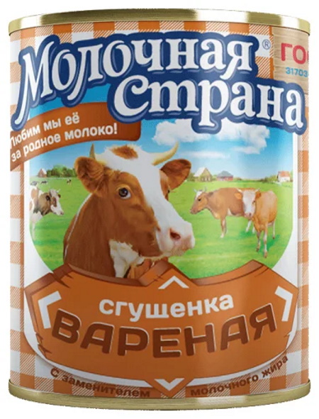 Milchkondensprodukt aus heimischer Produktion. Hergestellt nach traditioneller Technologie in Übereinstimmung mit der Norm. Enthält Vollmilch, Zucker, Sahne. Es hat einen charakteristischen Geschmack von gekochter Kondensmilch. Dichte homogene Masse von hellbrauner Farbe. Geringfügige Einschlüsse von Milchzuckerkristallen sind zulässig.
