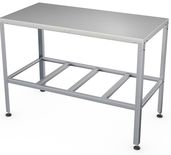 Installation auf drei Ebenen, die unteren beiden sind Regale, die obere ist ein Schnittbereich. Die Tischplatte ist mit Spanplatten verstärkt. Die Form des Rahmens und der Beine über die gesamte Länge ist rechteckig, am Ende der Stützen befinden sich runde Unterlegscheibenspitzen (Höhe einstellbar).