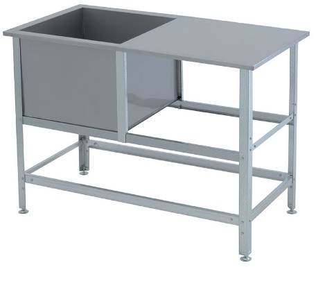 Produkte der heimischen Produktion in rechteckiger Form. Die Tischplatte von 3 Parteien ist mit kleinen Seiten ausgestattet. Es gibt eine rechteckige eingebaute Badewanne (horizontale Position), rechts in der Ecke auf der offenen Seite ein rundes Loch, das für einen Container zum Sammeln von Abfällen bestimmt ist. Der gesamte Rahmen ist aus korrosionsbeständigem Metall (rostet nicht). Die Arbeitsfläche ist auf der Innenseite mit einer Platte aus beschichteter Spanplatte (Spanplatte) verstärkt.