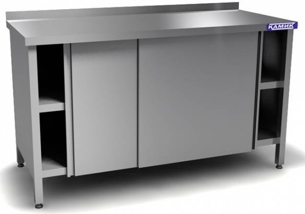 Tischschrank mit Fachtüren, einem Regal (bildet einen schmalen und breiten Raum) auf Metallbeinen mit Gummifüßen, die sanft den Boden berühren. Der Körper ist aus Stahl, allseitig geschlossen. In den unteren Räumen können Sie Küchenutensilien verstauen.