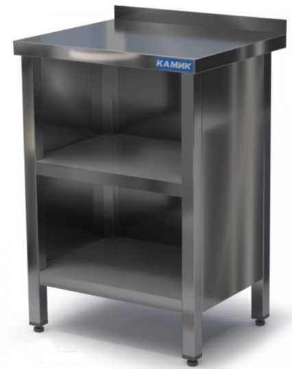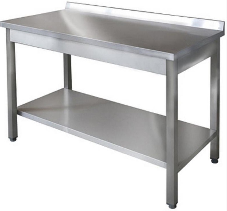 Installation mit einem Wandbrett zum Schneiden von Fleisch, Fisch, Gemüse und anderen Lebensmitteln. Die Beine sind höhenverstellbar, haben eine schonende Beschichtung, die die Oberfläche nicht angreift. Unten befindet sich ein Regal, dessen Steifigkeit durch eine Rippe bereitgestellt wird. Die Tischplatte ist mit doppelter Spanplatte verstärkt. Die Kanten des Rahmens sind bearbeitet und können Arbeiter nicht verletzen.