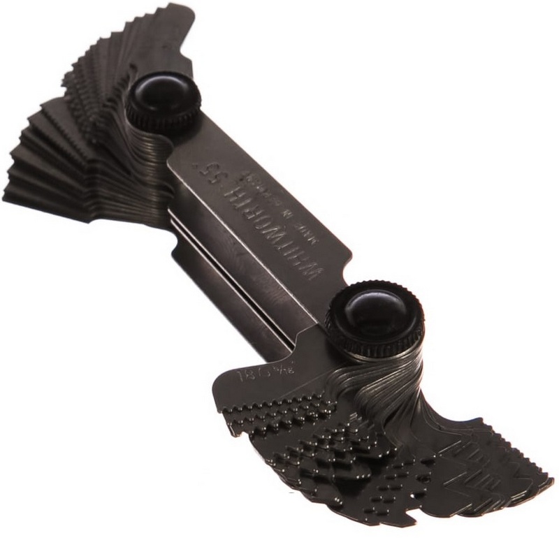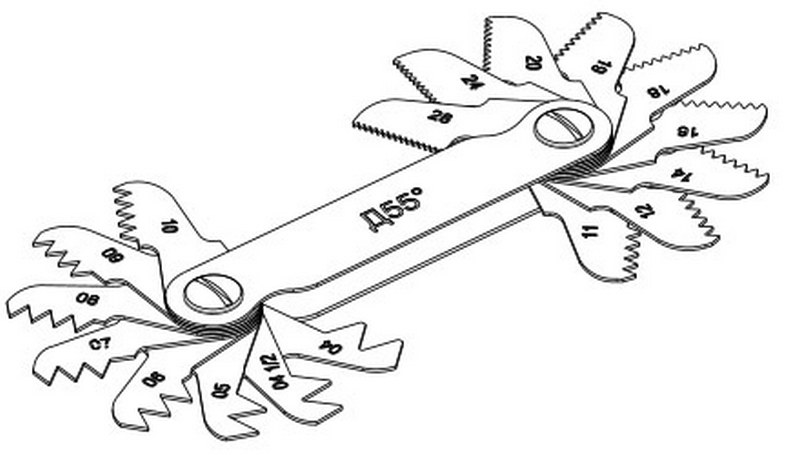 Sie werden verwendet, um die Eigenschaften von Zoll- und Rohrverschraubungen zu messen. Mit Hilfe dieser Instrumente wird genau die Anzahl der Windungen auf der Länge einer bestimmten Streckeneinheit gemessen. Der Körper solcher Gewindelehren ist mit „D55“ gekennzeichnet, was bedeutet, dass der Winkelgrad von Profilrohr- / Zollgewinden eine Anzeige von 55 hat.