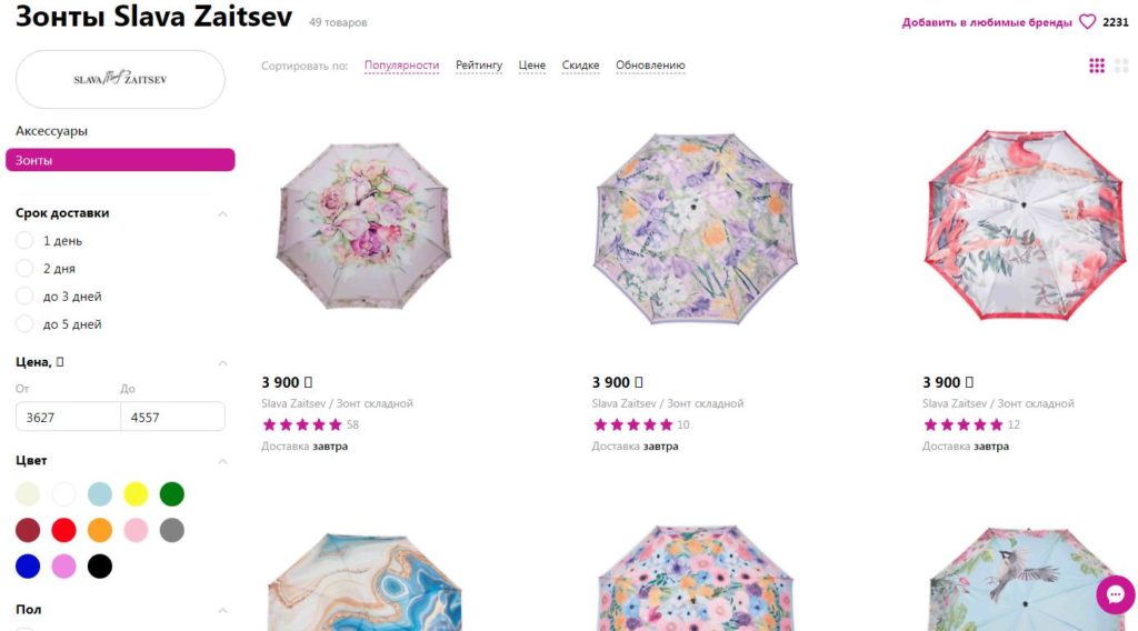 Der legendäre russische Modedesigner beschloss, sein Tätigkeitsfeld zu erweitern, und begann neben Kleidung auch Regenschirme mit einzigartigem Design herzustellen. Es ist möglich, individuelle Bestellungen auszuführen. Es ist nicht möglich, Accessoires des berühmten Couturiers auf der offiziellen Website zu kaufen, aber sie werden auf vielen Marktplätzen und in Online-Shops zum Verkauf angeboten. Die Vielfalt und Originalität der Farben werden durch hohe Qualität ergänzt. Neben teurem Zubehör nach Maß können Sie auch Modelle erwerben, die in der Regel erschwinglich sind.