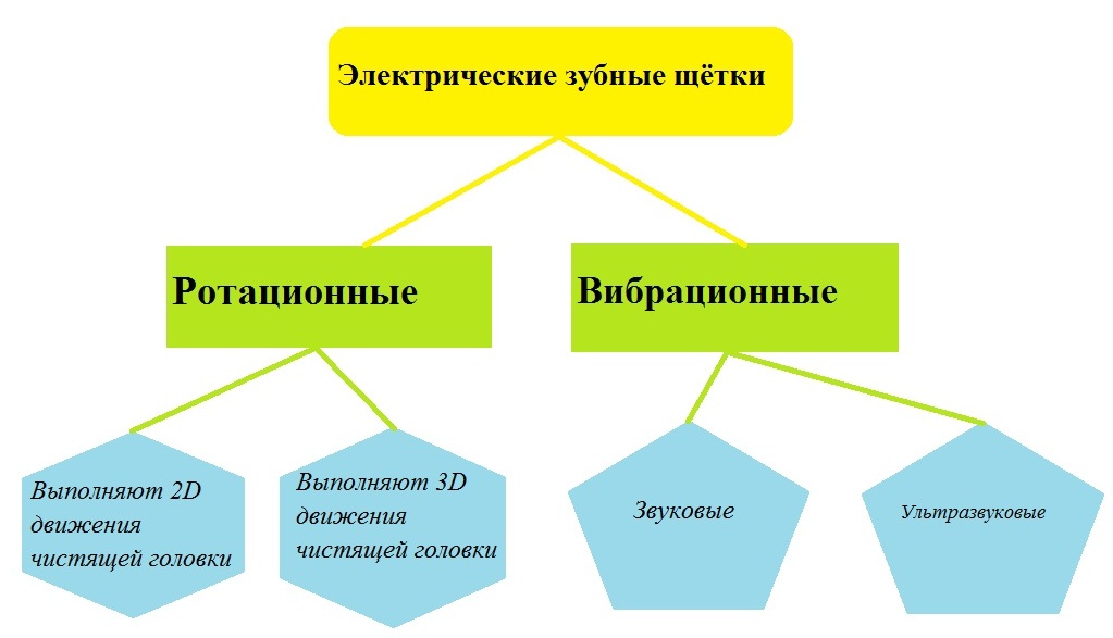 Es gibt zwei Hauptkategorien von elektrischen Zahnbürsten, jede mit ihren eigenen Zweigen. Um dieses Problem im Detail zu verstehen, ist es am einfachsten, das Schema zu betrachten: