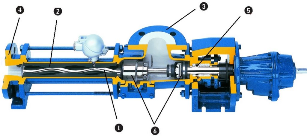 Die Wirkung einer solchen Pumpe ist wie folgt: Der Rotor, der eng an den Stator aus Elastomer anliegt, bildet eine doppelte Kette von vollständig abgedichteten Kammern. Während der Drehung des Rotors füllt die destillierte Flüssigkeit diese Kammern und gelangt allmählich vom Saugrohr zum Austragsrohr, während sich weder die Form noch das Volumen der Flüssigkeit in der Kammer ändert.