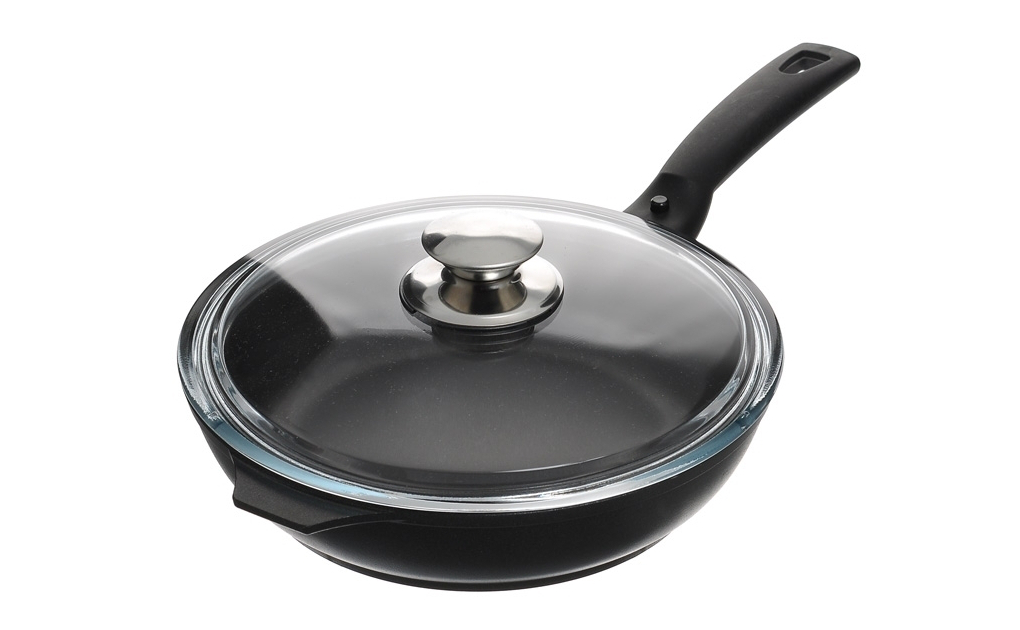 Die Bratpfanne eines bekannten italienischen Herstellers hat das Interesse der Verbraucher geweckt und nimmt daher eine hohe Position im Ranking ein. Es besteht aus Aluminium mit einer Keravis-Beschichtung, die das Anhaften von Lebensmitteln verhindert, hilft, alle nützlichen Eigenschaften zu bewahren, und sorgt außerdem für eine gleichmäßige Erwärmung der Oberfläche. Die Beschichtung ist sehr stabil, ermöglicht die Verwendung von Metallspachteln, Messern und Löffeln. Der nicht abnehmbare Bakelit-Griff erhitzt sich nicht und hält Temperaturen bis 160 °C problemlos stand, sodass die Verwendung der Pfanne im Backofen mit Temperaturregelung möglich ist.