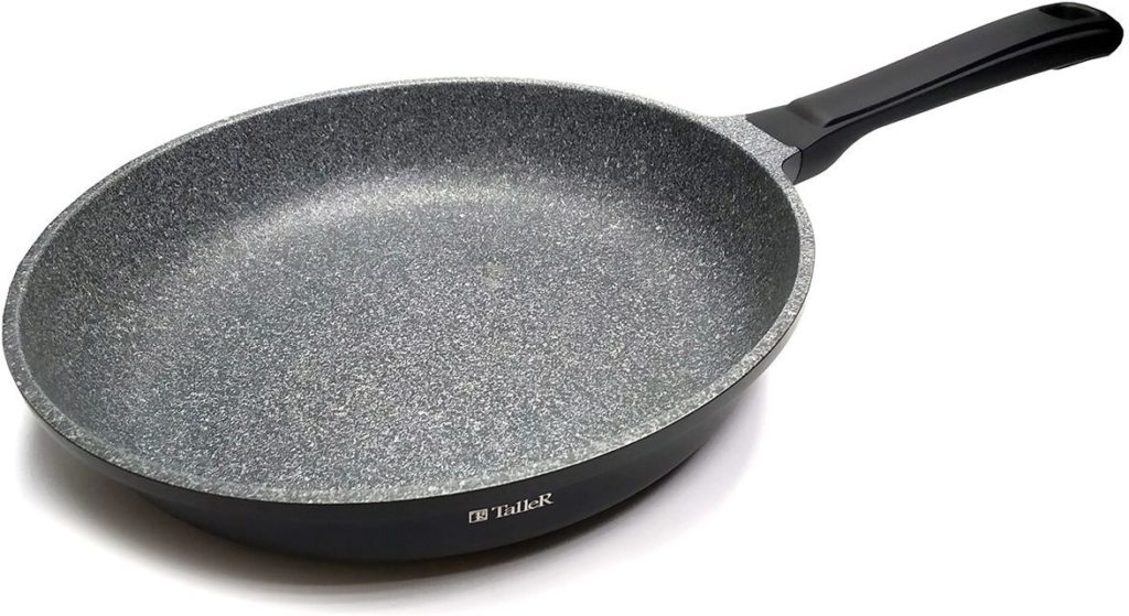 Die beliebte Marke Taller stellt eine universelle Bratpfanne dar, die auf allen Herdarten außer Induktion zum Braten, Schmoren und auch Backen im Backofen ohne Temperaturbegrenzung geeignet ist. Der Boden der Pfanne mit einer Dicke von 5 mm ermöglicht eine gleichmäßige Erwärmung der gesamten Oberfläche, die Wände mit einer Höhe von 2,5 mm helfen, die Wärme richtig zu verteilen und die wohltuenden Eigenschaften von Gerichten zu bewahren.