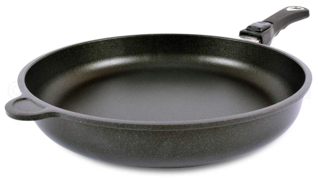 Die bekannte deutsche Marke AMT präsentiert ein Modell einer universellen Bratpfanne aus massivem Aluminium. Der Boden des Küchenartikels besteht aus einer Titan-Antihaftbeschichtung, die das Braten, Schmoren und Backen verschiedener Lebensmittel ermöglicht, während die enthaltenen Nährwerte erhalten bleiben. Es ist für alle beheizten Oberflächen geeignet, einschließlich Induktionsplatten.