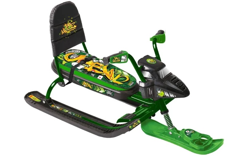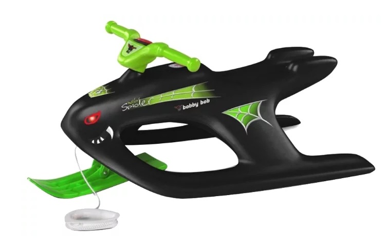 Für die Herstellung dieses Modells verwendete der Hersteller Kunststoff, der der Belastung standhält und auch keine Angst vor niedrigen Temperaturen hat. Aber dank dessen hat das Gewicht des Schneescooters abgenommen, es wird für Kinder einfacher sein, ihn nach der Abfahrt anzuheben. Die Kufen von „BIG Bobby-Bob Wild Spider“ haben Metallelemente, wodurch die Lebensdauer des Produkts einfach verlängert werden kann. Die Steuerung erfolgt über ein Motorlenkrad, das sich um 360 Grad drehen lässt. Der Hersteller hat hier auch ein Tonsignal installiert, mit dessen Hilfe der Fahrer vor seiner Annäherung warnt. Damit Unebenheiten auf Bodenwellen oder andere Fahrbahnunebenheiten nicht so stark sind, gibt es eine Federung an der Lenkachse.