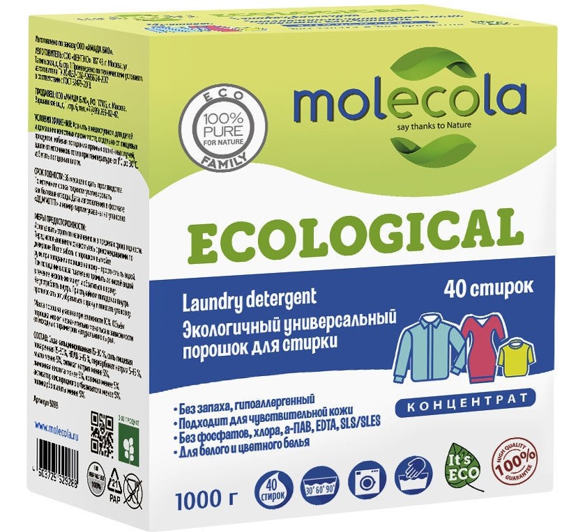Waschpulver ist für Maschinen- und Handwäsche geeignet, 0,5 kg reichen je nach Verschmutzungsgrad für 8-16 Wäschen. Beschädigt die Stofffasern nicht, sorgt für Weichheit und erleichtert das Bügeln. Enthält keine Duftstoffe. Vollständig ausgespült ohne zusätzliches Spülen. Zutaten: zerkleinerte pflanzliche Waschseife, Natriumpercarbonat, Glycerin, TAED-Aktivator. Durchschnittspreis: 320 Rubel.