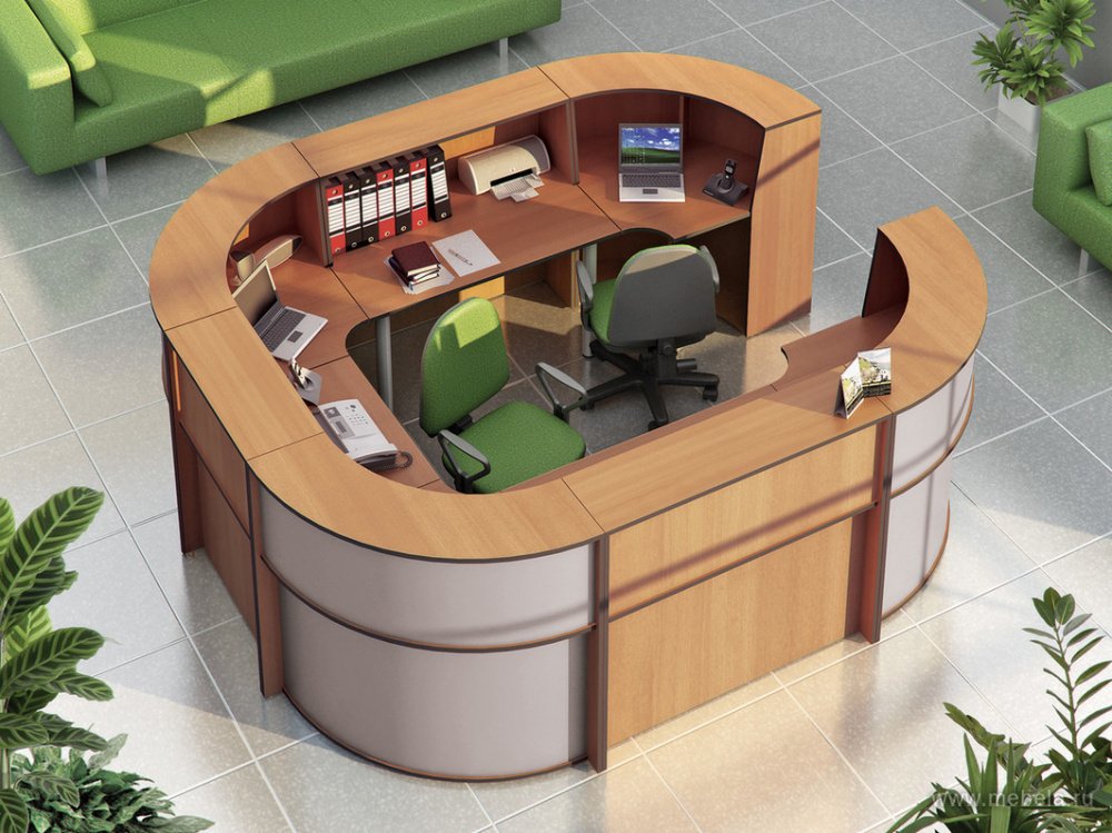 Wenn für den Empfang ein kleiner freier Bereich in der Ecke des Raums vorgesehen ist, ist ein Eckpfosten die beste Option. Es trennt den Arbeitsplatz des Administrators oder Bedieners vollständig vom allgemeinen Raum und kann eine organische Fortsetzung einer Reihe von Büromöbeln sein.