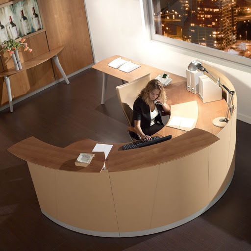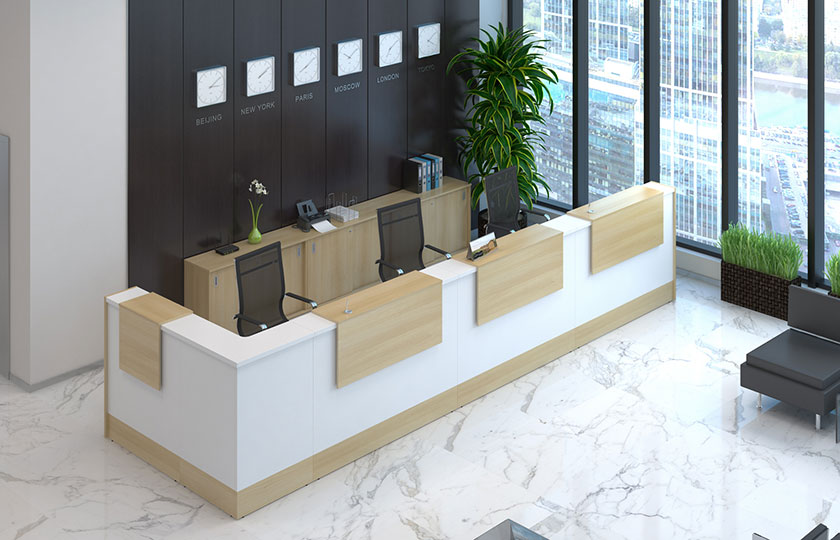 Auf einer großen Fläche mit ausreichend Freiraum kommen halbrunde oder U-förmige Empfangstische zum Einsatz. Sie sind in solchen Situationen die zentralen Figuren im Raum und mit großer Sorgfalt erstellt. Dank des großzügigen Innenraums können mehrere Mitarbeiter gleichzeitig an der Theke arbeiten und so eine bestimmte Anzahl von Besuchern im gleichen Zeitraum bedienen.