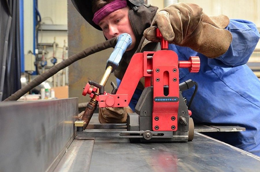 - Verbesserung der Gesamtqualität - Beim Schweißen mit einem Traktor ist der Abstand vom Winkel des Brenners (sowohl über als auch entlang der Fugen) bis zum Ausgang der Schweißbrennerdüse, der die Lichtbogengröße festlegt, dauerhaft und wird durch das Schweißen kontrolliert Taschenlampe in der Halterung installiert. Die Geschwindigkeit bleibt über die gesamte Bogenstrecke entlang der Verbindung unverändert. Die Bewegungsbahn des Lichtbogens unterliegt ebenfalls der Steuerung. All dies trägt zu einem kontrollierten Einbrand, der Erzeugung einer feinschuppigen und gleichmäßigen Schweißnahtstruktur, der Vermeidung von Hinterschneidungen, einer Erhöhung der geometrischen Qualität der aufgebrachten Schweißnaht und der Schaffung eines glatten Flusses der aufgebrachten Raupe zum Grundwerkstoff bei. Bei Verwendung des oszillierenden Blocks des Brenners wird die Schweißqualität der Verkleidungs- und Füllraupen der Nähte mit vielen Übergängen verbessert.Selbst wenn die Schweißnaht nicht richtig montiert ist, kann eine gute Arbeitsqualität erzielt werden, da die meisten Schlitten Stopprollen haben, die die Nahtlinie verfolgen können, während sie den Weg des Schweißbrenners korrigieren.