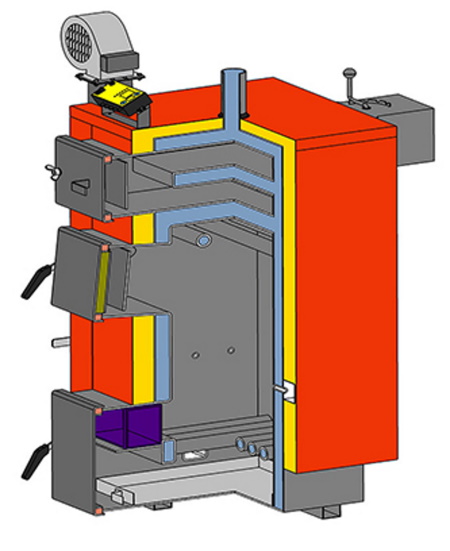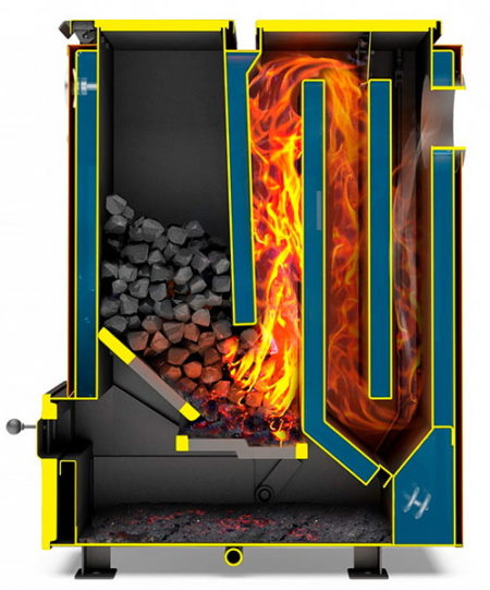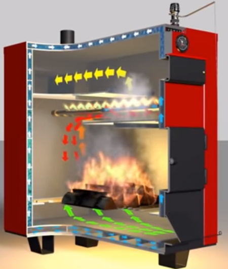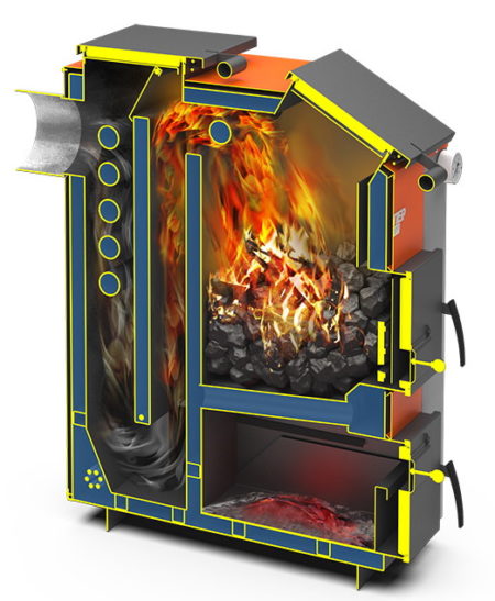 2. Pyrolyse - unterscheiden sich in der Anwendung des Prinzips der getrennten Verbrennung von Materialien und Gasen, die bei der Verbrennung entstehen.Beim Mischen mit einströmendem Sauerstoff wird Wärme in großen Mengen freigesetzt. Abfall in Form von Asche und Ruß wird praktisch nicht gebildet, und die Effizienz des Geräts ist sehr hoch. Erhöhte Anforderungen an den Feuchtigkeitsgehalt von Brennholz, der 15 Prozent nicht überschreiten sollte, sind zwingend einzuhalten.
