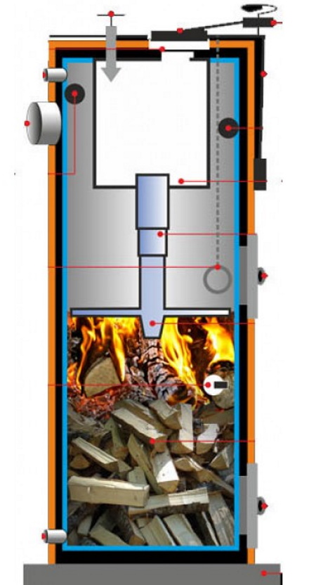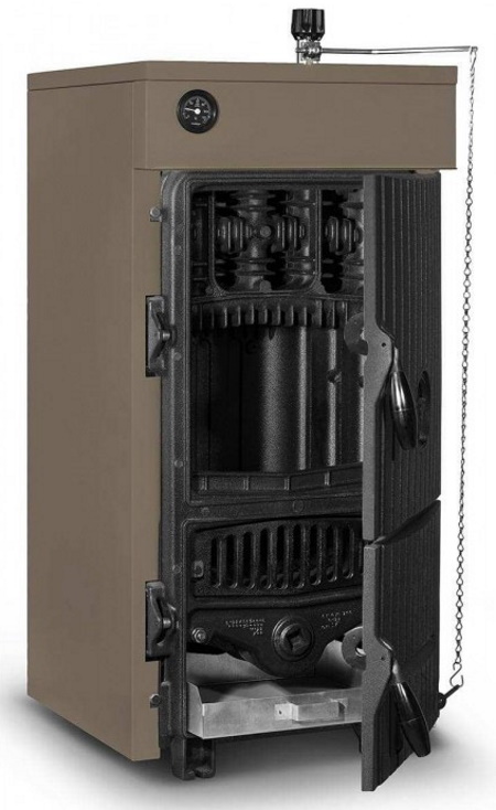 Ein modernes Kompaktprodukt mit stilvollem Design eignet sich perfekt zum Heizen eines Landhauses bis zu 100 m2. Er wird mit Brennholz oder Briketts beladen, die oben auf den Kessel gelegt und angezündet werden. Wenn das Gerät läuft, brennt das Brennholz aus und das Feuer senkt sich langsam. Wenn der Verbrennungszyklus abgeschlossen ist, muss die Asche entfernt und die nächste Portion Brennholz geladen werden.