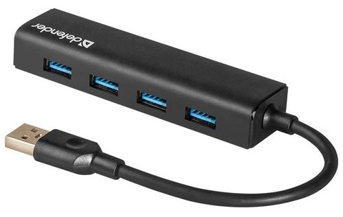 Der passive Splitter Defender Quadro Express ist in klassischem Schwarz gehalten. Dem Benutzer stehen vier USB 3.0-Anschlüsse zur Verfügung, die Daten mit hoher Geschwindigkeit übertragen können - bis zu 5 Gbit / s. Der Strom pro Port beträgt 900 mA.