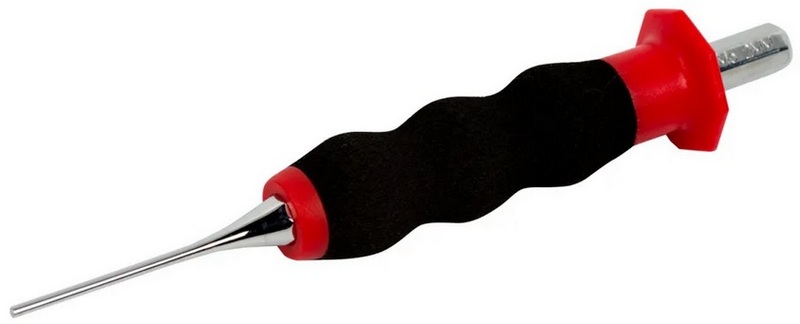 Dieses Gerät ist mit einem langen Stachel ausgestattet, mit dem Sie Löcher in Metallteilen reinigen können. Seine hohe Festigkeit ermöglicht es Ihnen, so effizient wie möglich zu arbeiten. Länge, mm - 180, Spitzendurchmesser, mm - 8. Es kann perfekt in der Metall- und Zimmerei und für Gravurarbeiten verwendet werden. Die empfohlenen Kosten für Einzelhandelsketten betragen 180 Rubel.