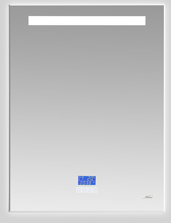 Aquaton (Russland). Stil - Hightech. Rechteckige Leinwand - Breite 100 cm, Höhe 70 cm Zusätzlich eingebauter Vergrößerungsspiegel. Beschichtung - ein spezieller Film (Schutz vor Feuchtigkeit, Beschädigung). Licht (oben, unten) - LED-Streifen 12 Watt. Eingebaute elektronische Uhr, Berührungsschalter.