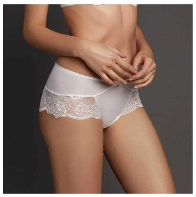 Modelle mit einem Spitzendesign, das die Hüften schmückt, sind die Schwäche der meisten Frauen.Ein gelungenes Muster und Spitze stehen jeder Figur gut und verleihen dieser durch das durchscheinende gemusterte Material Eleganz. Bei einer hohen Passform sollten große Frauen jedoch vorsichtig sein und mittel oder niedrig wählen. Weiße Farbe gibt Unschuld und korrigiert Volumen visuell.