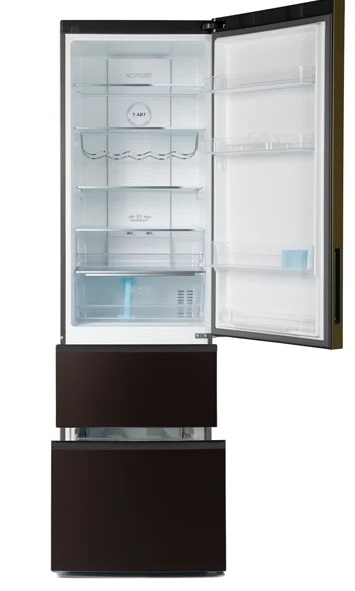 Dieser Dreikammer-Kühlschrank hat eine Front aus gehärtetem Glas in Schwarz. So wird das Gerät nicht nur zu einem notwendigen Küchengerät, sondern auch zu einer echten Raumdekoration.