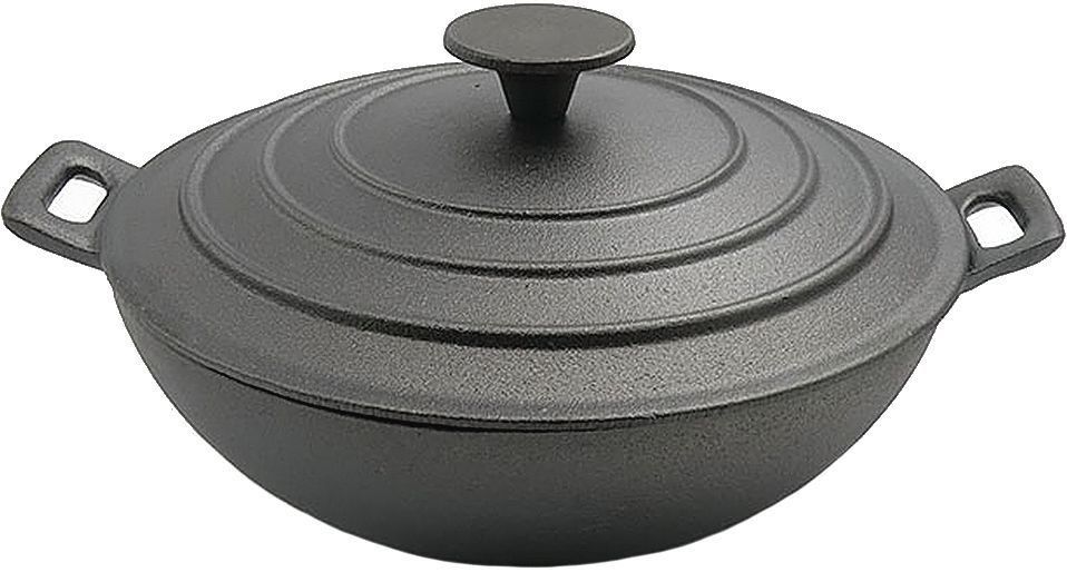 Die Griffe befinden sich auf beiden Seiten und sind mit dem Pfannenboden vergossen. Kommt mit einem gebogenen Deckel. Auch aus Gusseisen.
