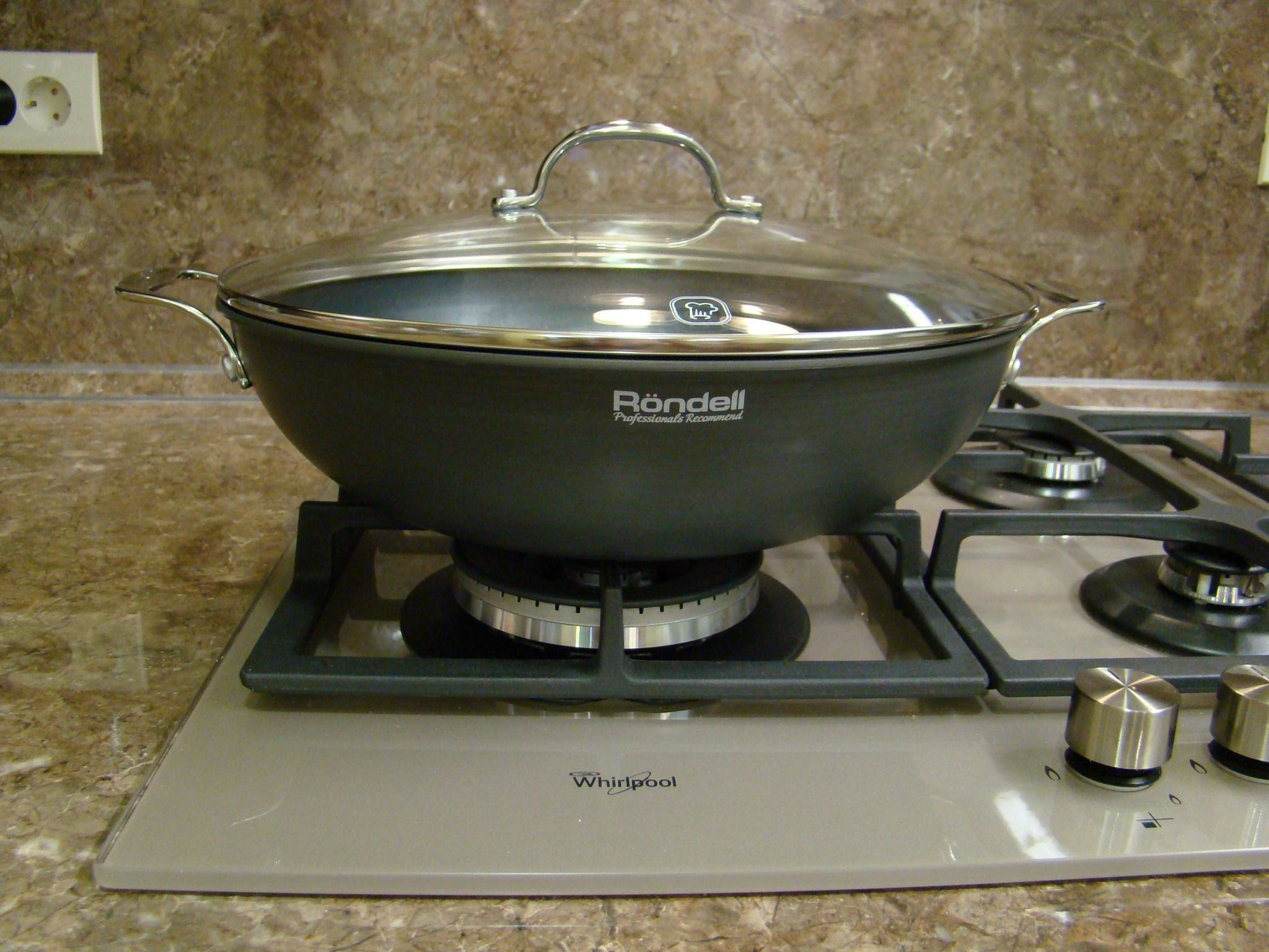 Das Design wird jeden beeindrucken. Der Wok selbst besteht aus Aluminium mit Marmorpartikeln, wodurch er keine Angst vor Kratzern und Stößen hat. Und der mit dem Kit gelieferte Deckel ist aus Edelstahl (auf Hochglanz poliert) und oben befindet sich ein Glasfenster (durch das Sie den Kochvorgang beobachten können).