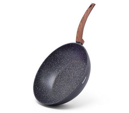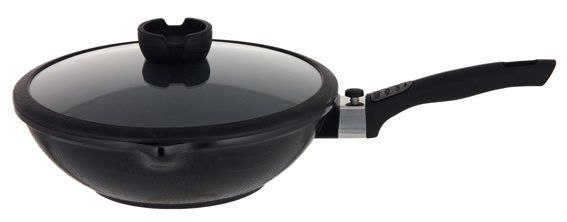 Eines der beliebtesten Wok-Modelle. Sein Durchmesser beträgt 28 Zentimeter. Das Design ist streng, schwarze Farbe herrscht vor. Der Bezug ähnelt Krokodilleder. Es hat einen langen Griff, der entfernt werden kann. Dies macht es bequemer zu lagern. Hergestellt aus Aluminium, wodurch es leichter wird. Die Erwärmung erfolgt schnell und gleichmäßig. Es gibt eine Antihaftbeschichtung. Der Glasdeckel passt dank der Silikondichtung perfekt auf die Pfanne.