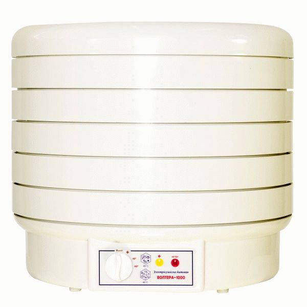 Dieser elektrische Trockner ist einer der leistungsstärksten und gehört zur Kategorie Metallkonvektion. Darin können Sie nicht nur Gemüse und Obst kochen, sondern auch Fleisch, Fisch und Pilze. An der Unterseite des Geräts ist ein Ventilator installiert, der die auf +70 Grad erwärmte Luft durch den Innenraum beschleunigt. Die Wärme wird durch ein Heizelement mit Keramikbeschichtung bereitgestellt. Das mit diesem Gerät getrocknete Produkt behält fast vollständig sein ursprüngliches Aussehen und seinen Nährwert. Der Trocknungsprozess ist schnell, Sie können eine beträchtliche Menge laden. Dadurch werden die hohen Energiekosten teilweise kompensiert.