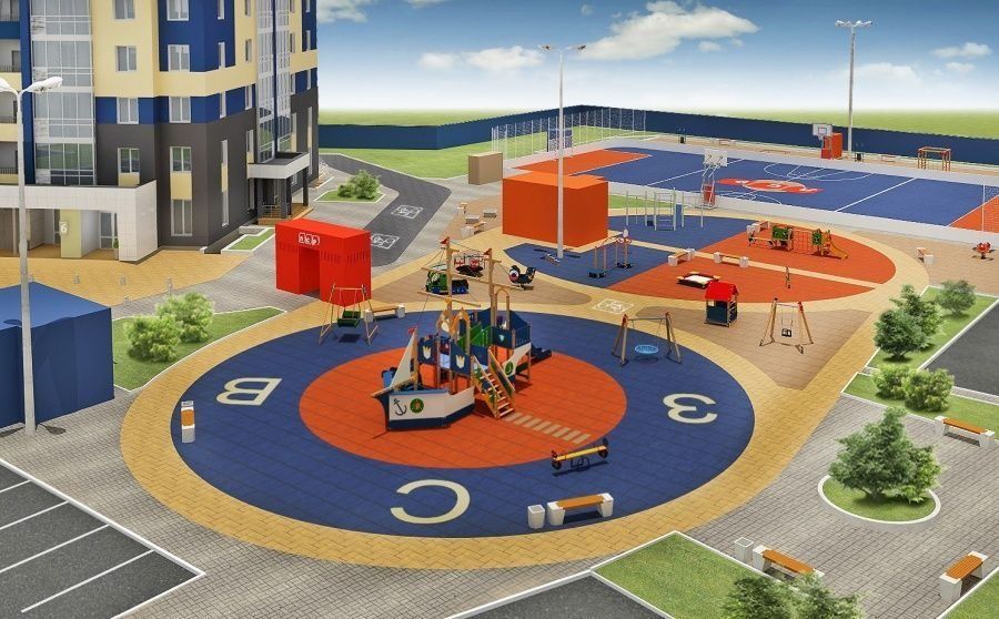 The site is not simple, but is made according to the theme of the flagship. It is designed for both young children and teenagers and adults, intelligently divided into zones. Children will study the ship, swings, slides and wall bars and climbing frames. Teenagers and adults will have a good time on the various sports courts and bike paths. Landscaping is done in the form of beautifully trimmed shrubs and lawns.