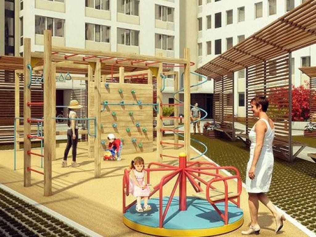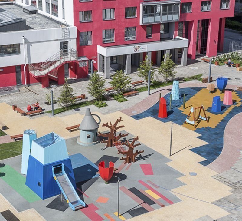 The Novatorov quarter is a private European-level residential complex in Yekaterinburg. It is located in the city center on Novatorov Street. The playing area here was developed by the Danish company KOMPAN, which specializes in this area. The company's engineers and psychologists developed every element, from the swing to the climbing frame, as a result of which the project turned out to be interesting and varied. The area is divided into zones according to the ages of the children. For toddlers, the play area develops motor skills and coordination. For teenagers - sports courts with a special coating for playing football and basketball. In the dark, the area of the gaming complex is beautifully lit, it's nice to just walk or sit on a bench.