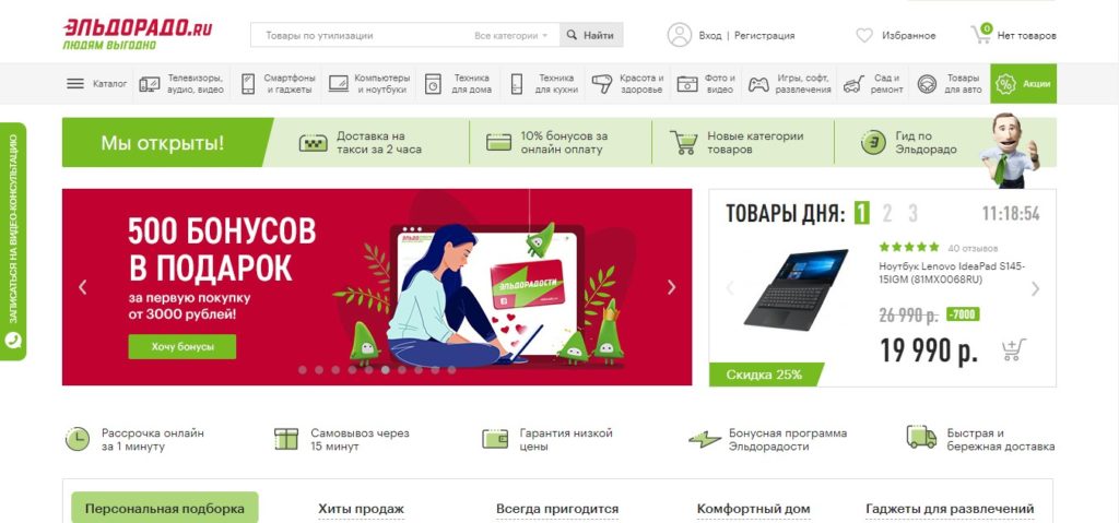 Eldorado made the following phrase as their slogan: "People are comfortable." Indeed, it is convenient for buyers to use the services of this site, as there is a large assortment, a lot of hot offers.In addition, the points of issue themselves (in the case of self-delivery) are located in many cities of Russia in a part of the city that is convenient for most residents.
