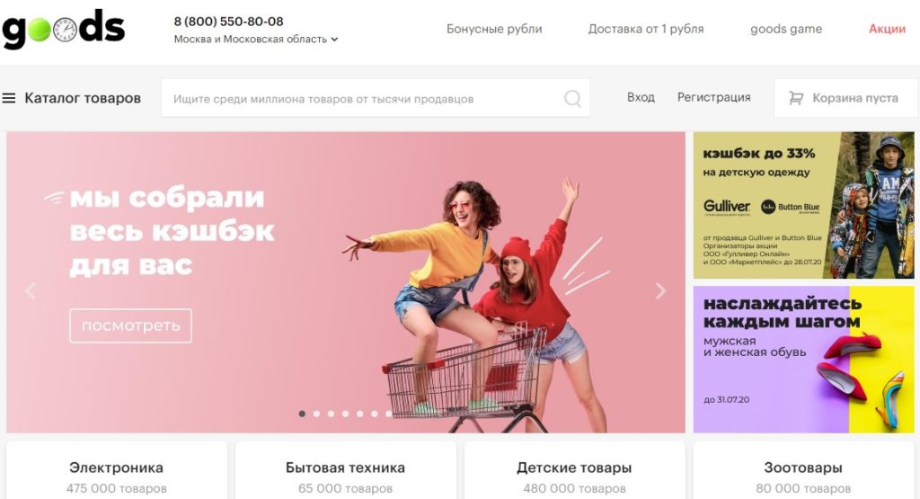 The marketplace has collected only the best online stores that have passed quality control. Moreover, Goods expands their number every year so that the buyer has even more choice. In addition, regular promotions are held on the platform, so making purchases here is not only convenient, but also profitable.