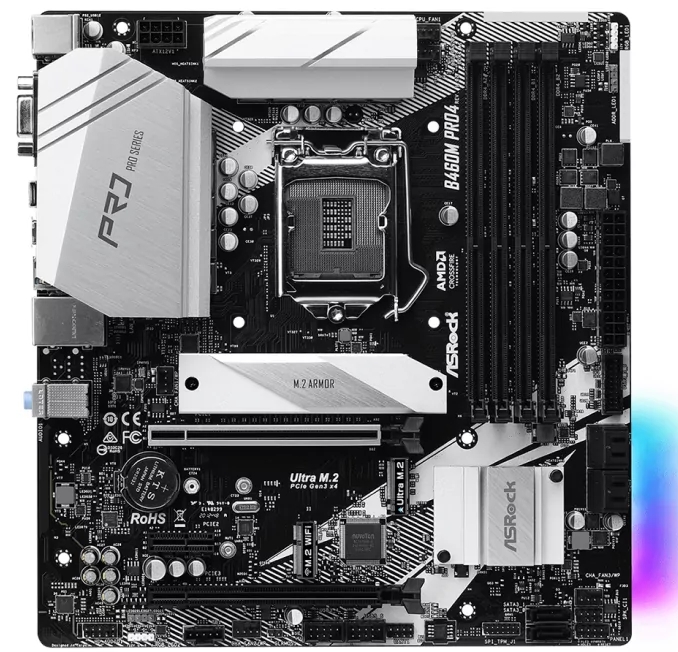 The basis for assembling the PC was the ASRock B460M PRO4 motherboard, which, despite the relatively low cost, is equipped with 4 slots for DDR4 RAM. In addition, the model is equipped with 2 PCI-E x16 ports, a fairly practical and fresh BIOS for configuring system elements, as well as heatsinks on all the necessary components. There is also a PCI-E/SATA 3.0 M.2 media port with an exclusive heatsink.