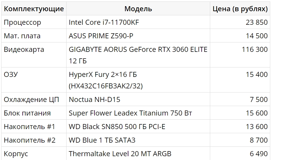 On the internal memory side, it is recommended to take a 1 TB SSD (17 thousand rubles), which will be enough for any tasks of a true player. It is better to supply a PSU with a power of 650 to 700 W, and you can spend from 4,500 to 7,500 RUB on the case, depending on the manufacturer.