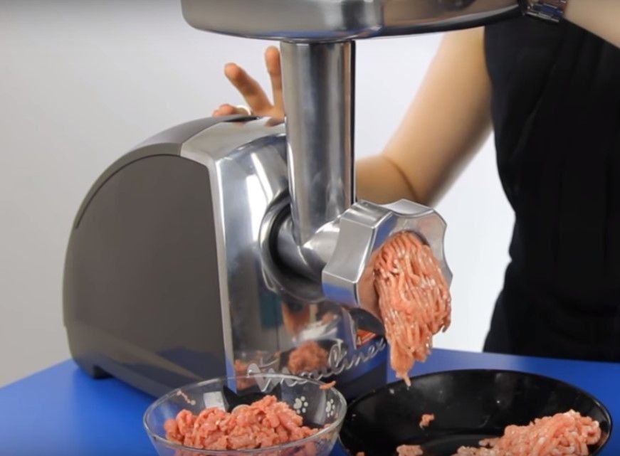 The higher the compartment for minced meat processing is located, the more voluminous dishes are placed under it to collect the already finished chopped product.