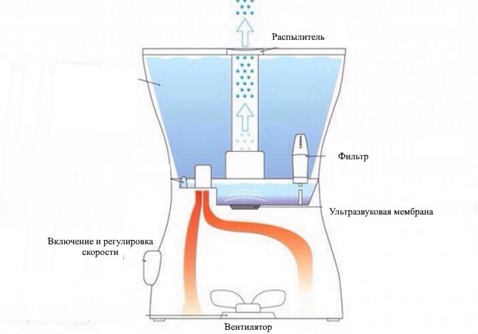 Humidification in the process of converting water into a "cloud" by high-frequency vibrations of a special emitter (piezoceramic membrane). The dry air driven by the fan through the device comes out in the form of a cold and moist mist. Some devices may be with the "warm steam" function. As a rule, they are equipped with a built-in hygrometer for switching to sleep mode when the designated humidity level is reached.