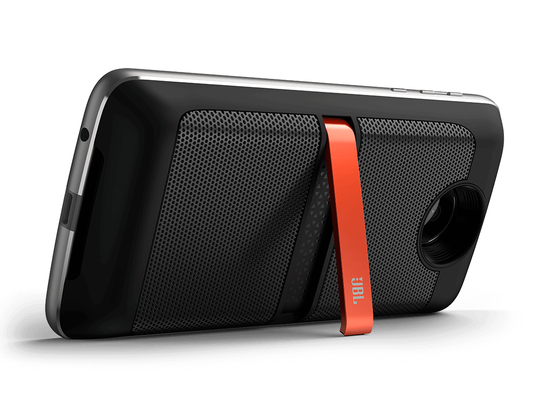 Music lovers can buy wireless speakers for smartphones separately. JBL speakers are known for their good acoustics. And the Moro Z smartphone not only allows you to connect to such accessories, but also has a built-in JBL SoundBoost Speaker module that attaches to the back cover. The speakers are automatically connected, and the music is already transmitted to them. The sound quality is good and the module completely replaces wireless speakers. The JBL SoundBoost Speaker is also equipped with a stand in the form of a leg, which is conveniently extended and with the help of it the phone is placed on the surface.