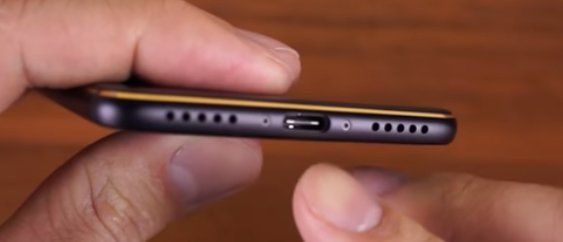 From the bottom, the smartphone is equipped with a Type C connector, which is used for recharging and synchronization. But the package does not include a cable, so you need to buy it separately. There is no headphone jack, and the phone needs an adapter to use the headset, which is included in the package.