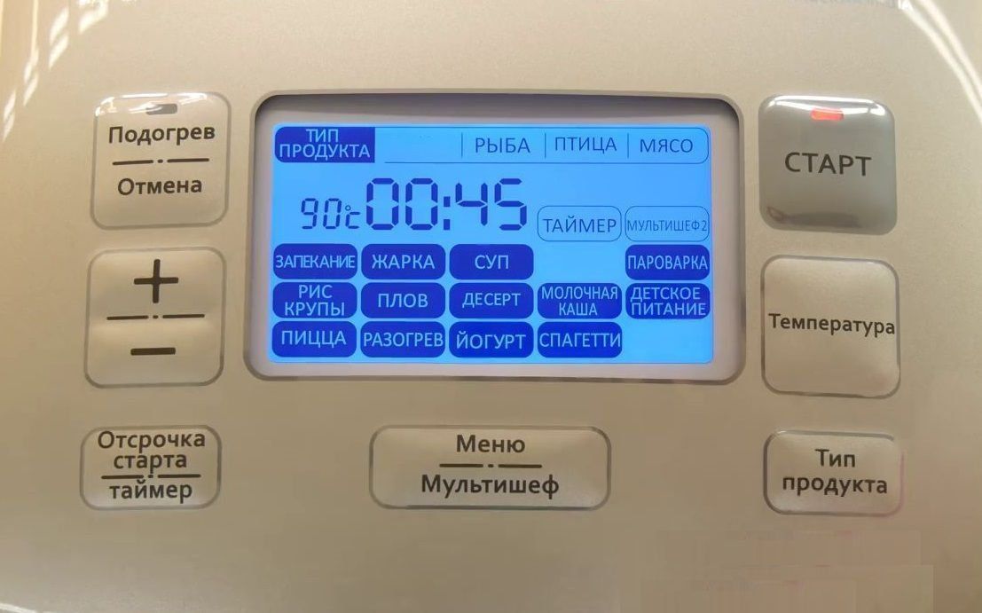 Electronic control offers a choice of 21 modes. Cooking programs include the following: milk porridge, frying, baking, yogurt, cereals, steaming and multicooking with the ability to cook your own dishes.