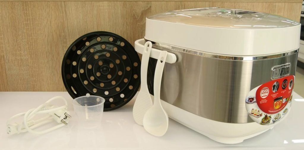 The package includes a measuring cup, a plastic scoop and a steaming basket, and it also differs from other models and is made not of plastic, but of stainless steel.