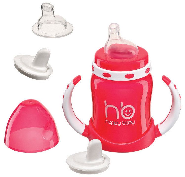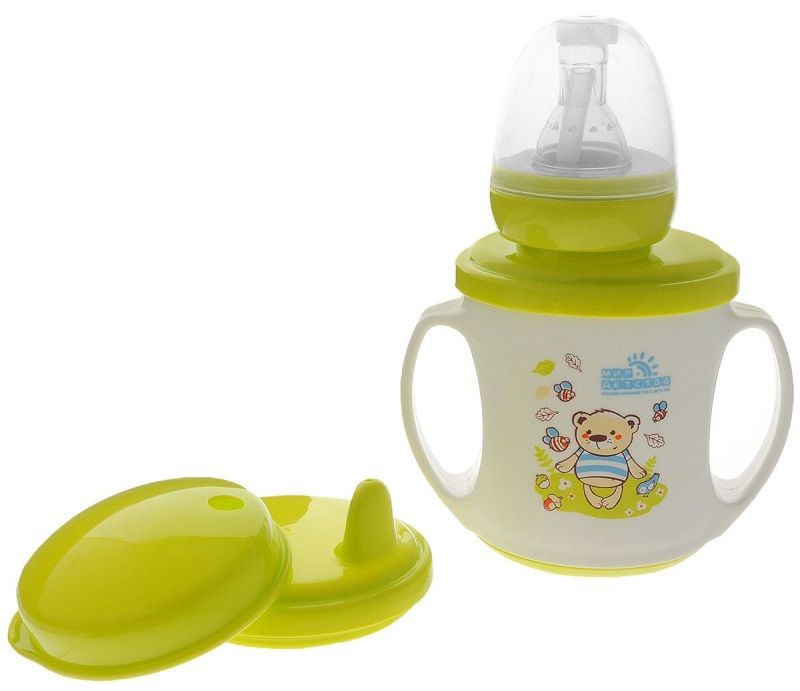 For babies aged 3-4 months, training cups have been invented. They are distinguished by their small volume, the presence of removable handles and a soft spout. If necessary, the latter is easily replaced by a nipple. Such a 3 in 1 transforming cup is offered by the Russian company Mir Detstva. With such advantages as a budget price and interchangeable nozzles, juices cannot be poured into the container, and there is no valve and measuring scale.