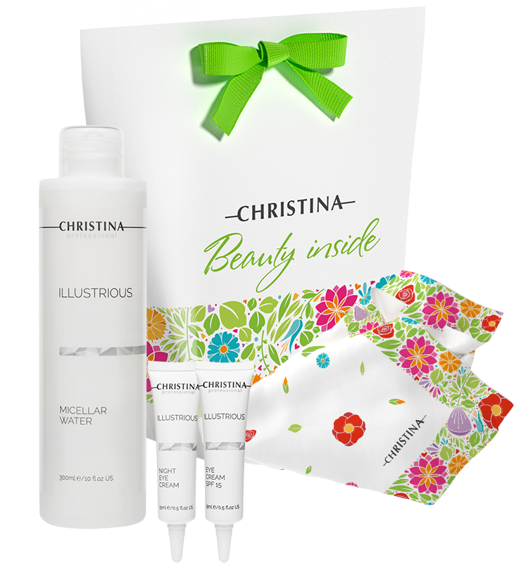 The skin around the eyes needs gentle care, Christina presents a gift set for the care of the skin around the eyes, in a bright spring look. Complete set: micellar water, day and night cream for the skin around the eyes, gift branded scarf Christina Floral Collection 75*75 cm, gift box. Price: 5300 rub.