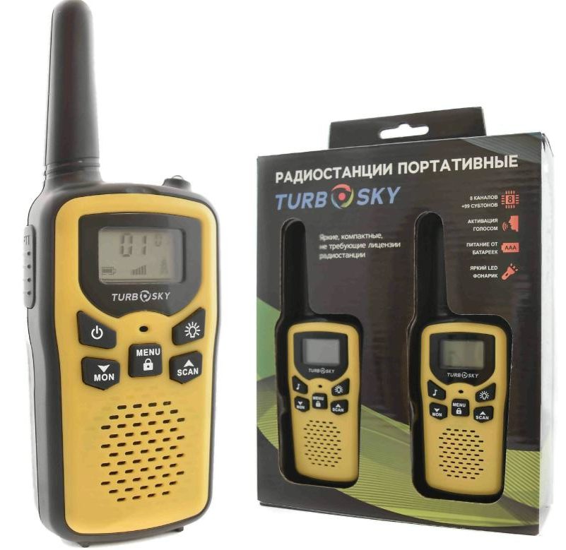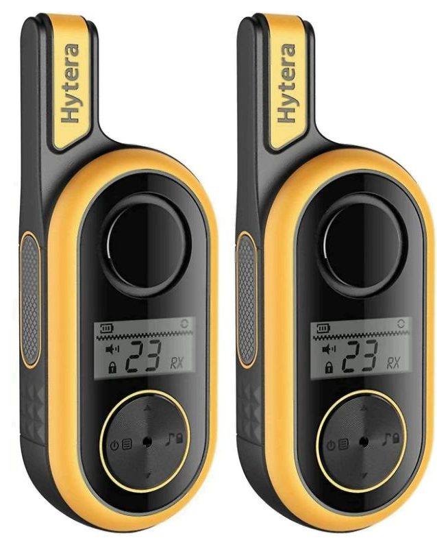 A set of two portable devices in bright black and yellow works in the PMR standard. Provides power from four batteries type AAA NiMH 1.2 V, and alkaline batteries type AAA 1.5 V. Headset jacks are available.