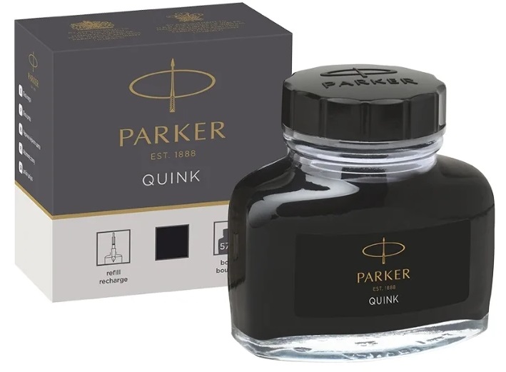This ink from the famous Parker brand is produced in France. They have three color options: black, blue and blue-black. Parker Bottle Quink comes in a glass bottle with a plastic cap. On the roof there is a company logo and brand name. Also on the bottle itself there is a label, the same color as the ink. Also, the color of the ink is indicated on the box in the form of a colored square.