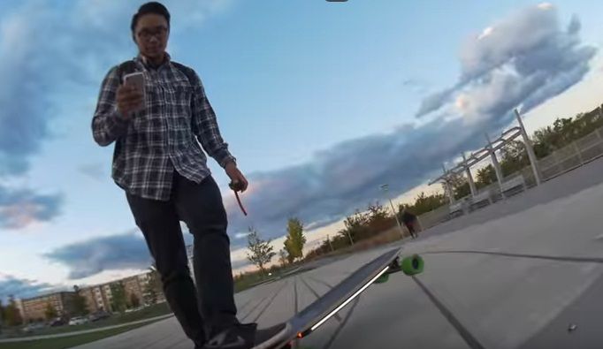Smart electric skateboard with lights of different, interchangeable colors on the remote control, with the ability to control braking, speed through the smartphone app A feature of the device is the ability to create various combinations of lighting effects. A smart system monitors overload, overheating and protects against power surges.