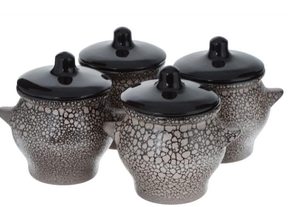 Each of the four pots of the set holds 700 ml and comes with a lid. The baking effect is achieved due to the porous structure of the walls. The round shape of the lid ensures the preservation of the thermal balance of the contents.The composition of the glaze inside and outside includes only environmentally friendly materials. Small handles on the sides make it easy to hold, place and remove the pot from the oven. Can be placed in the microwave. The set is packaged in a thick cardboard box with separate compartments for each item. The packaging is beautifully designed and tied with jute twine, which makes it possible to use the set as a gift.