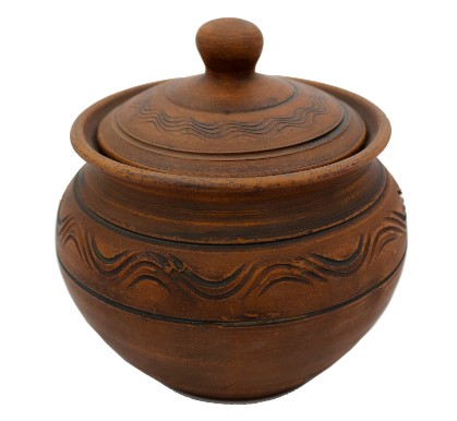 An excellent red clay baking pot will help prepare stewed dishes for the first and second. The volume of 600 ml is enough for one serving for an adult. Classic rounded shape, carved decoration on the lid and walls. Brown natural color. The lid is easy to grip. For greater comfort when using in the cooking process, it is recommended to purchase a fork. Before use, it is advisable to soak the vessel in water for an hour so that the walls are saturated with moisture, which during the cooking process will be given to the contents to give a unique taste. Can be used in microwave. Wash without the use of household chemicals and abrasive washcloths.