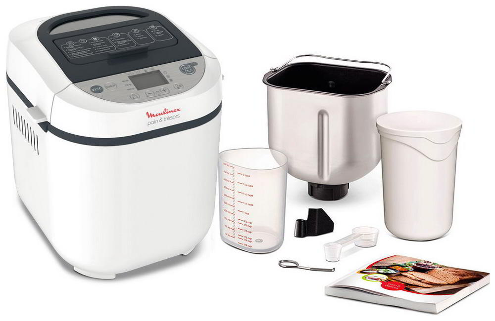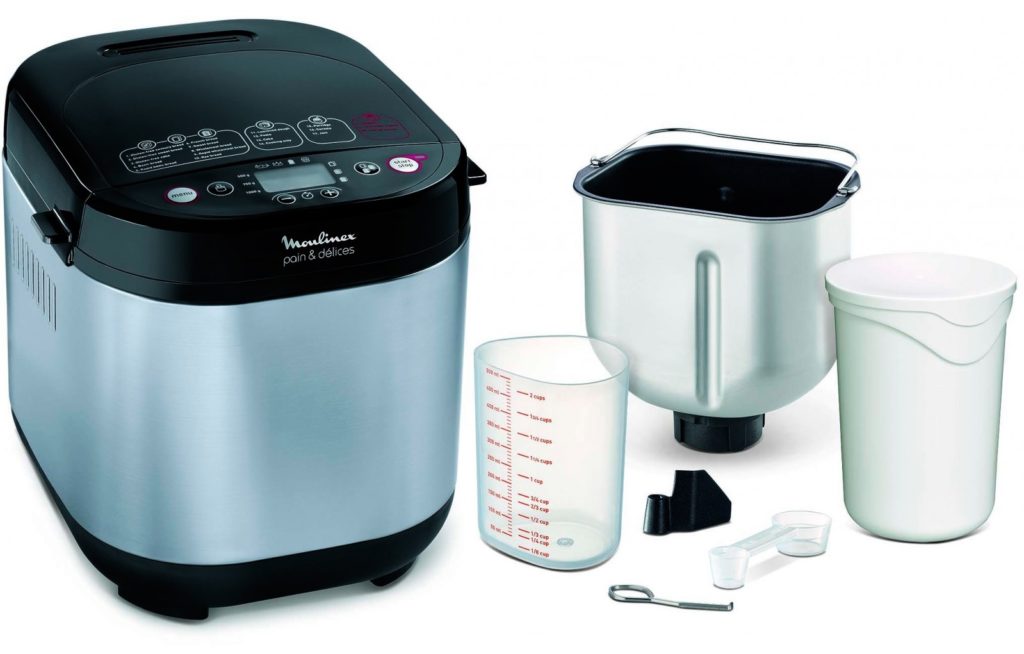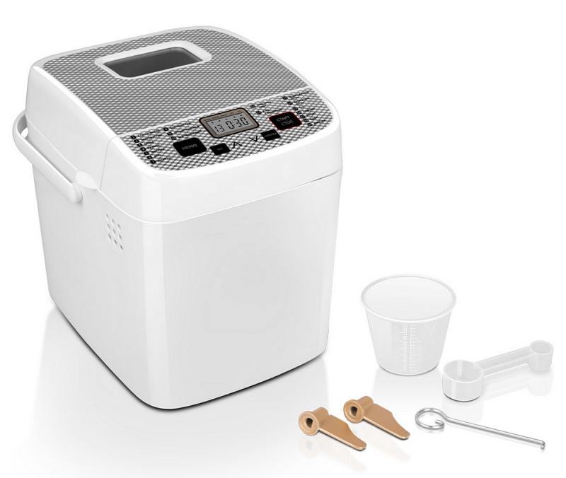 The device has a delayed start option, a display, a good choice of operating modes, which allows you to use the device for cooking a large number of different flour and other products. The complete set of the device provides for the presence of a cup with measurements, a spoon, blades for kneading, a mold for yogurt.