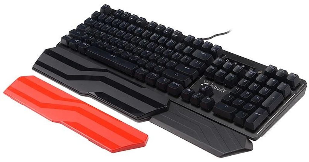 With an aluminum alloy metal body, a nano-coated PCB and a wide wrist rest on the left side, which is typical of Bloody devices. Plus RGB lighting with 3 modes and 6 effects (just press Fn + F12 to change) and support for up to 16 million color options.